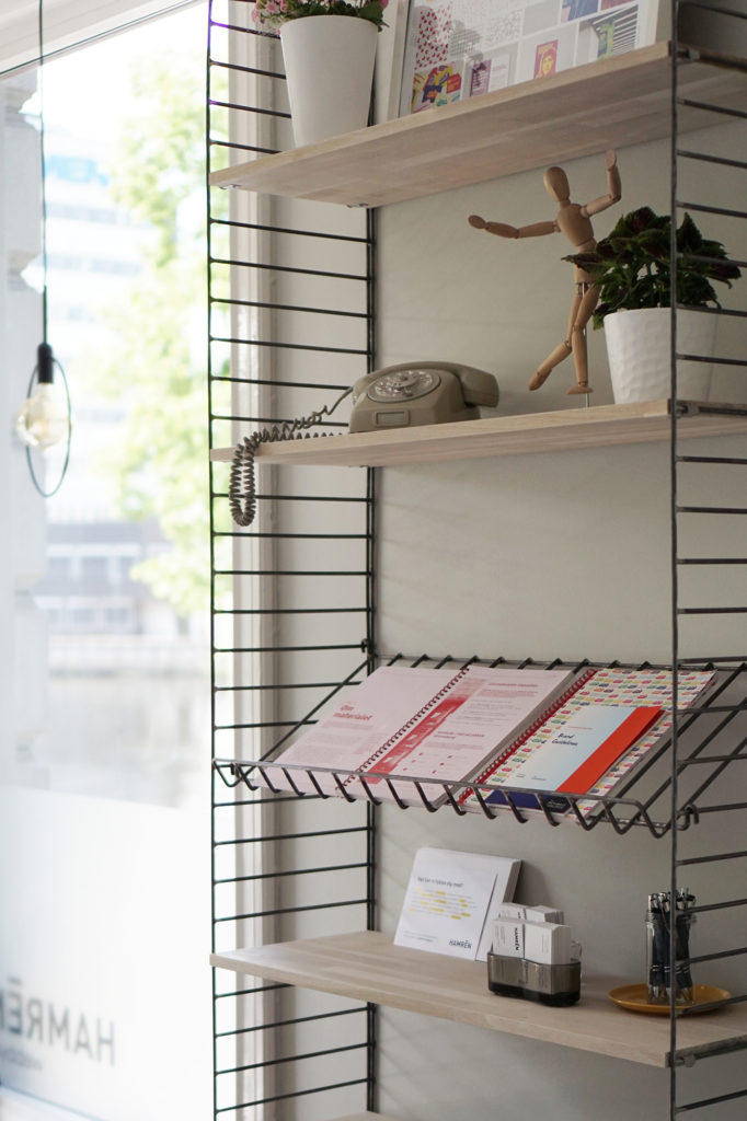 På Norrköpingskontoret har vi dessutom fått lyxen att få specialdesignade lampor till våra höga sekelskiftesfönster. Dessutom har vi även en snygg vägghängdhylla som ger oss möjlighet att visa upp våra egna trycksaker och andra detaljer som vi tycker om. Bilderna ovan är från vårt eget kontor och vi är mycket nöjda och tacksamma!