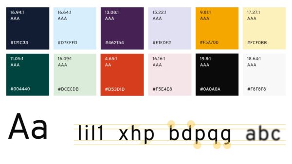 Därför har vi valt färger med stora kontrastbetyg (i enlighet med WCAGs tillgänglighetskriterier) och använt dem i kombinationer som blir lika tillgängliga för personer med t.ex. färgblindhet. Färgerna bidrar även till att skapa en mer förutsägbar navigation, då olika sektioner på webbplatsen är färgkodade för att lättare känna igen var man är (t.ex. alla nyheter har en gul bakgrund, alla event en blå).