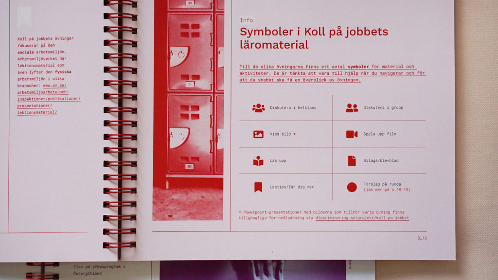 Vi på Hamrén har utifrån den grafiska profilen som vi tagit fram för projektet Koll på jobbet tagit fram koncept och layout för ett metodmaterial på mer än 100 sidor. Projektet riktar sig till ungdomar på yrkesprogram och metodmaterialet fungerar som ett omfattande hjälpmedel och stöd för lärarna i undervisningen kring det här viktiga ämnet. De informativa och inspirerande texterna som Koll på jobbet teamet har sammanställt samspelar med tänkvärda bilder och en spännande men ändå tillgänglig layout för att skapa en lättanvänd bok som ger eleverna makten att stå upp för sina rättigheter i yrkeslivet.