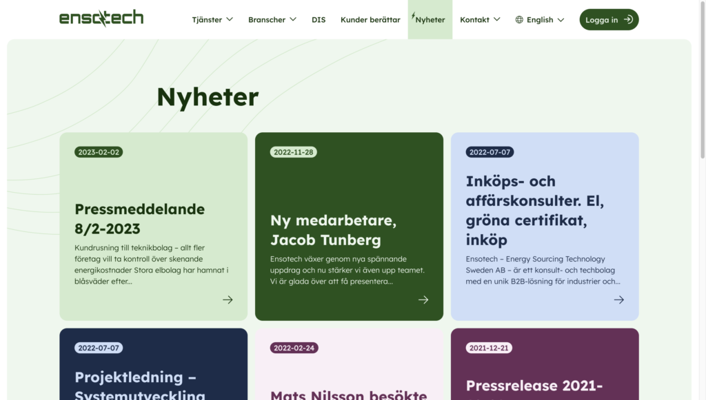 De behövde även fler färger att implementera i Ensotechs egna system. Vi såg behovet och möjligheten av att kunna separera innehåll i olika block för att hålla längre texter visuellt intressanta i bland annat nyheter så väl som case. Med utgångspunkt från den mintgröna tog vi fram en ny färgpalett. De primära färgerna är gröna för Ensotechs huvudfokus på hållbarhet. Med kompletterande färgerna ger det mer liv och dynamik för innehållet. Det finns ett rosa, blått och grönt tema, dessa kan i sin tur varieras i ljust respektive mörkt utförande.