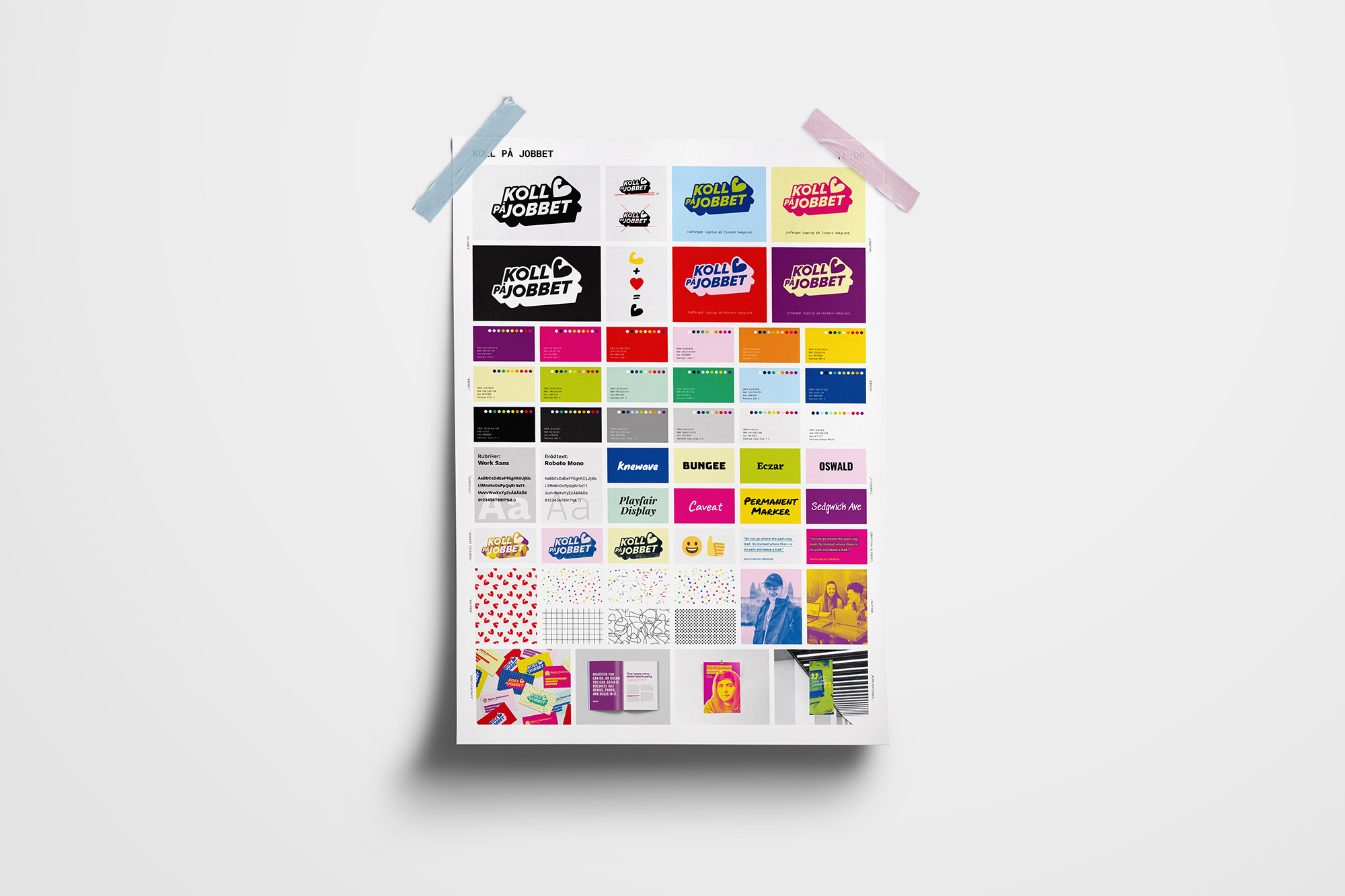 Vårt uppdrag har varit att ta fram en komplett varumärkesidentitet för projektet Koll på Jobbet. Logotyp, färger, typografi, grafiska element, bildmanér och tonfall. Oftast siktar varumärken på igenkänning genom enhetlighet, men denna varumärkesidentitet skapar igenkänning genom mångsidighet.