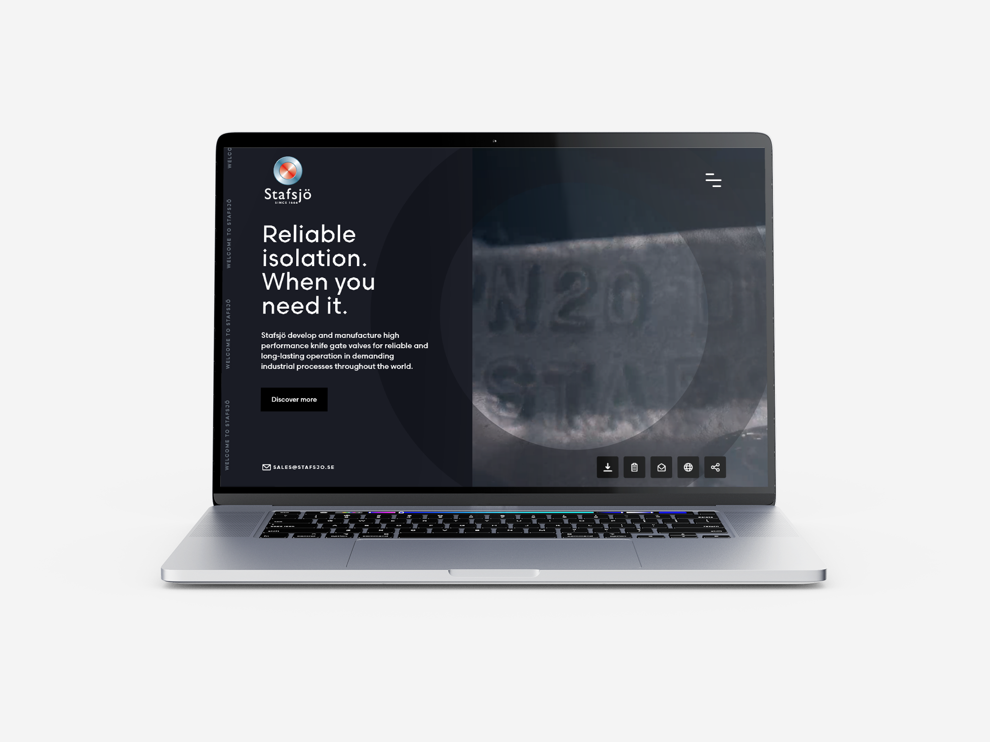 Att framhäva företagets anor var en självklarhet, men att visa på förmågan till teknisk innovation kändes minst lika viktig. Stafsjo.com är företagets främsta säljplattform, och redan där ville vi synliggöra Stafsjös tekniska expertis genom att göra något annorlunda. Inspirerade av skjutsjällsventilen, som reglerar flöden genom tillslutning, valde vi att vända navigationen: från den traditionella, vertikala till nytänkande horisontell.