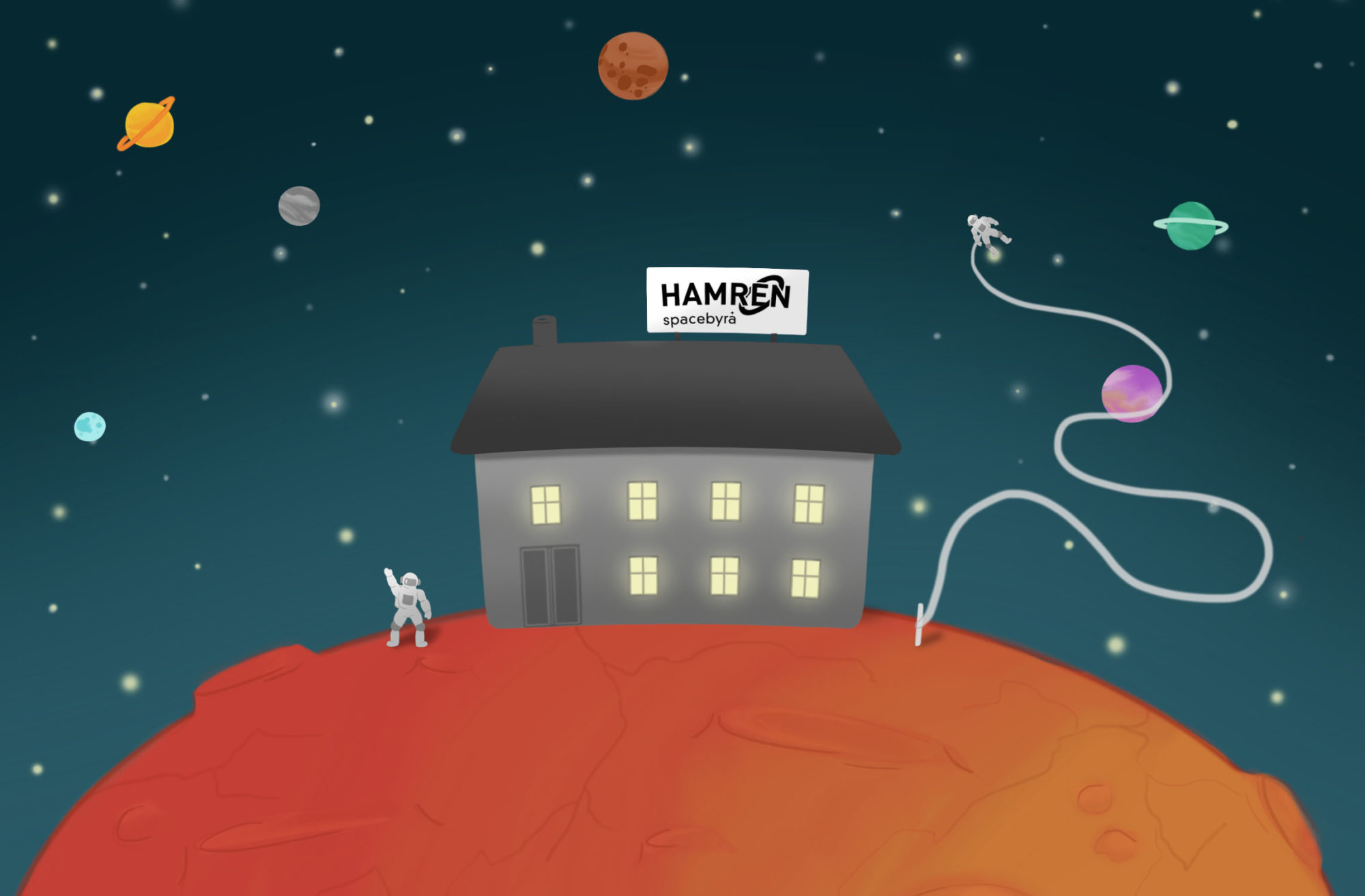 Hur skulle det egentligen vara om Hamrén i framtiden skulle öppna ett kontor på Mars? Skulle design se annorlunda ut om målgruppen var utomjordningar? Kommer webbsidor inte bara behöva anpassas efter dator, surfplatta och mobil, utan också rymddräkter? Kommer trycksaker bli ersatta av hologram? Kommer man äntligen kunna trycka en stark blå i CMYK? Kommer inkluderande design till slut vara den nya standarden? Vi är i vilket fall som helst taggade och redo att anpassa oss efter nya utmaningar.